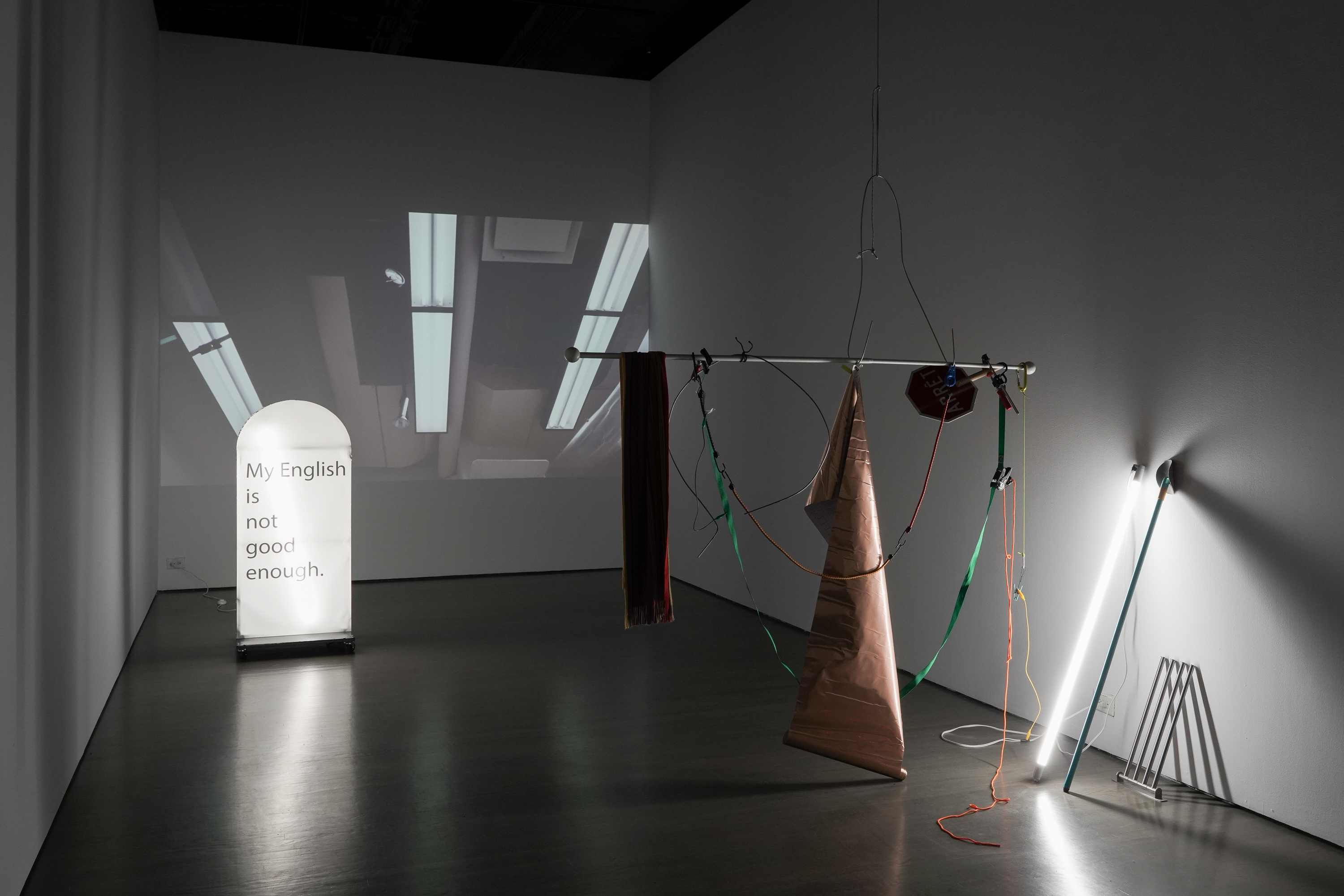 Avec my english is not good enough/mon anglais n’est pas assez bon, l’artiste utilise une enseigne de magasin courante en Corée du Sud pour afficher une expression quotidienne ici, à Montréal. Cette œuvre invite à réfléchir aux points et intersections multiples de communication en jeu dans cet échange.