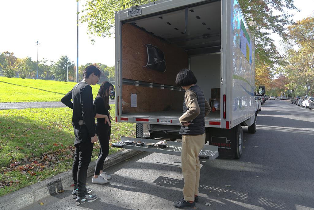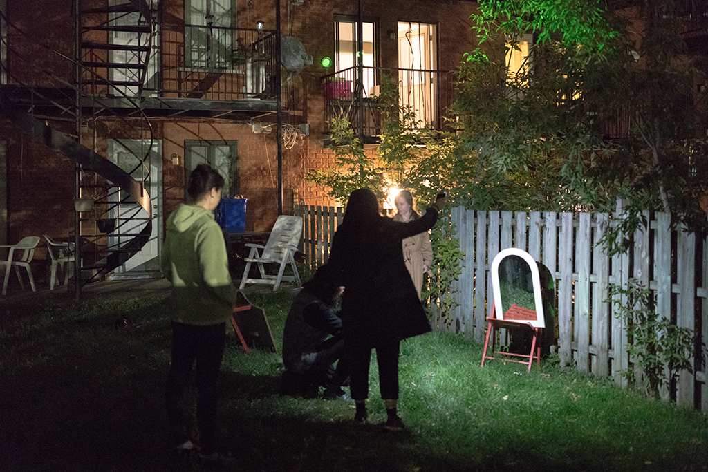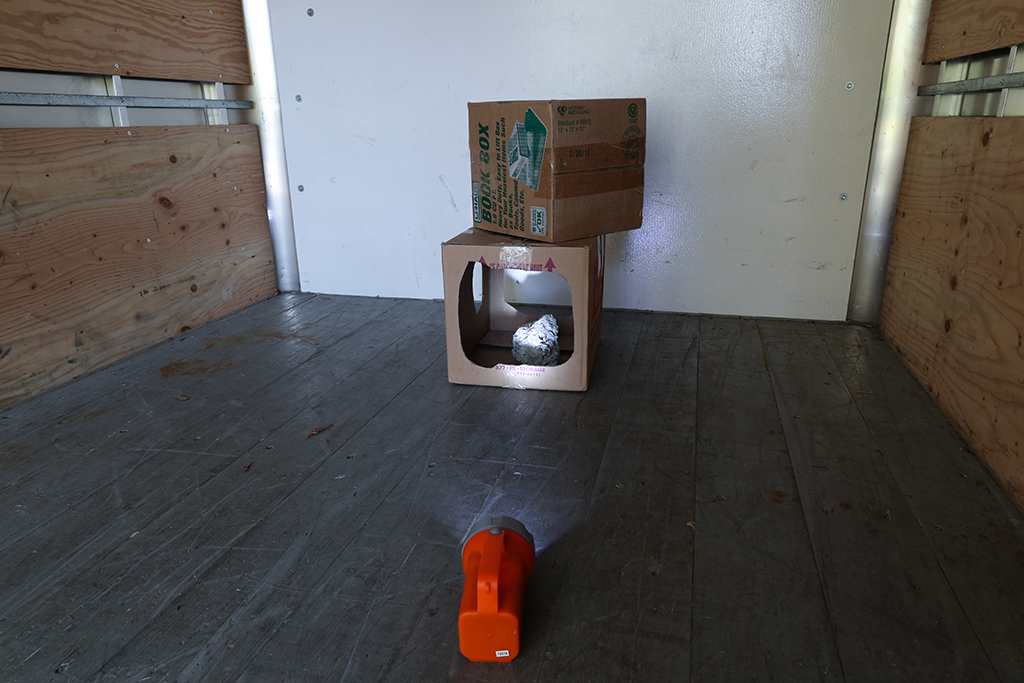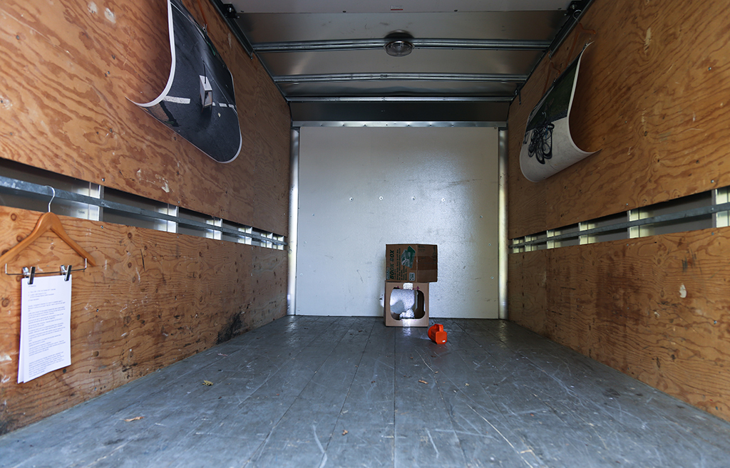 While at a public park in Montreal, we stared up at the almost full moon shining in the clear night sky. We started to discuss the UHaul project in abstract terms; movement and light. Expanding on the ongoing Chandeliers project, which is a collaborative, and site-specific installation project, we both thought that it would be nice if we could “pack” the “moonlight” into a moving trailer somehow.