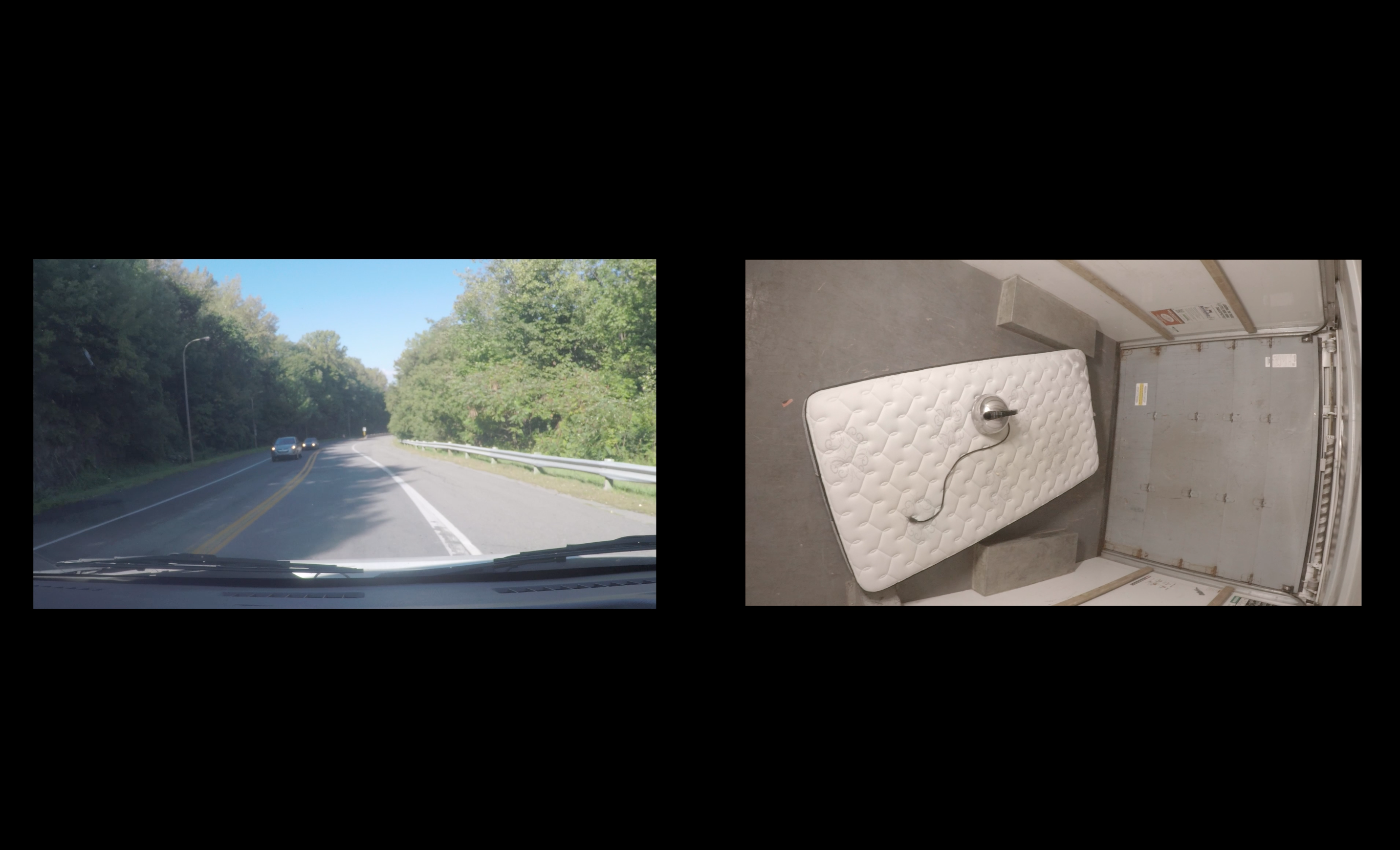 Two objects are placed and rely on each other inside the moving trailer. Each time the moving trailer moves, these two objects show instability due to the speed of the vehicle and trembling due to the condition of the road surface. Sometimes it will crash into the wall, It will hit each other and tangle. When the vehicle stops, we see the distance between these two objects. The physical experiences that these two objects having as they moved, it is implicitly projecting the situation of emotional movement in the relationship.