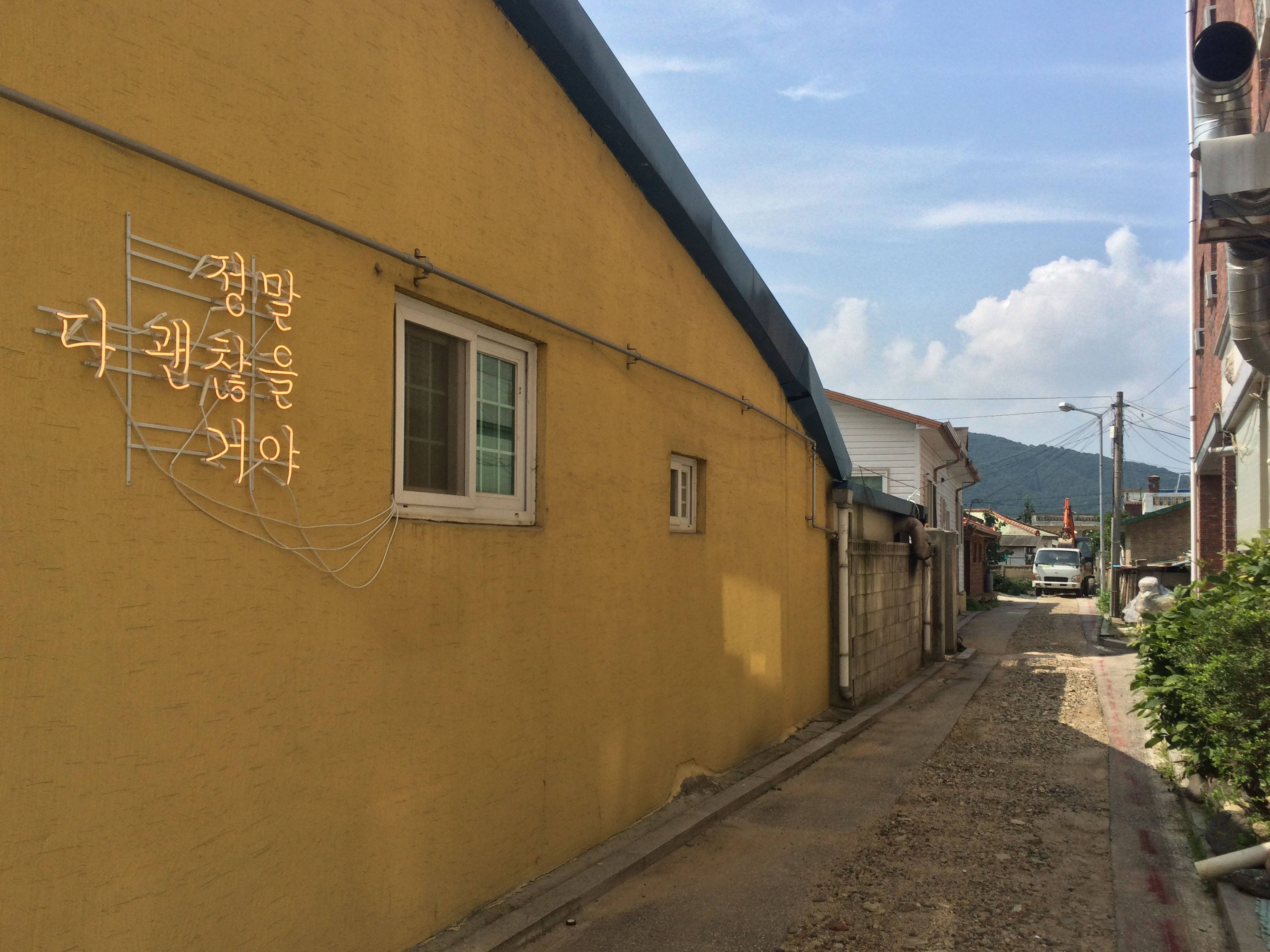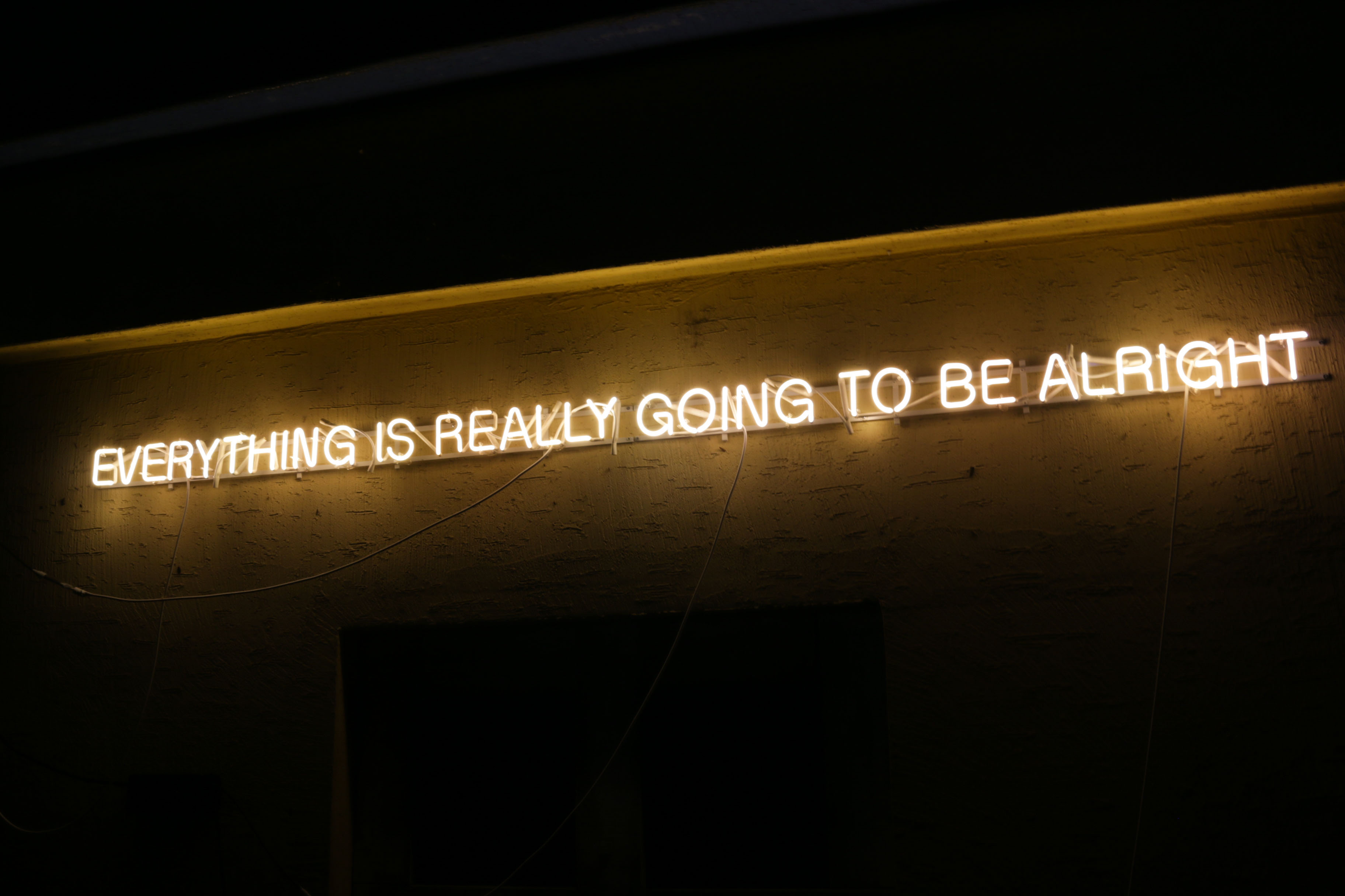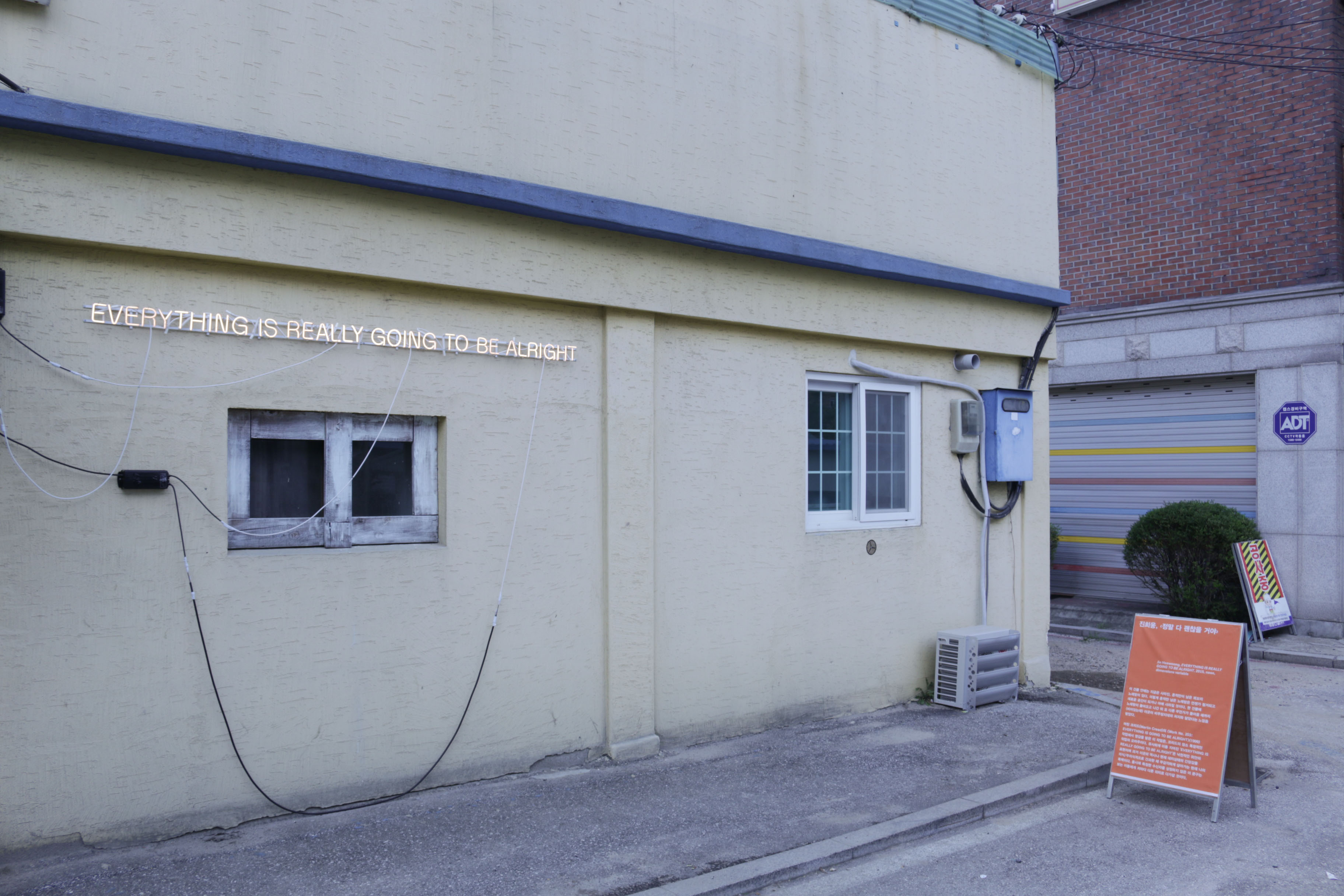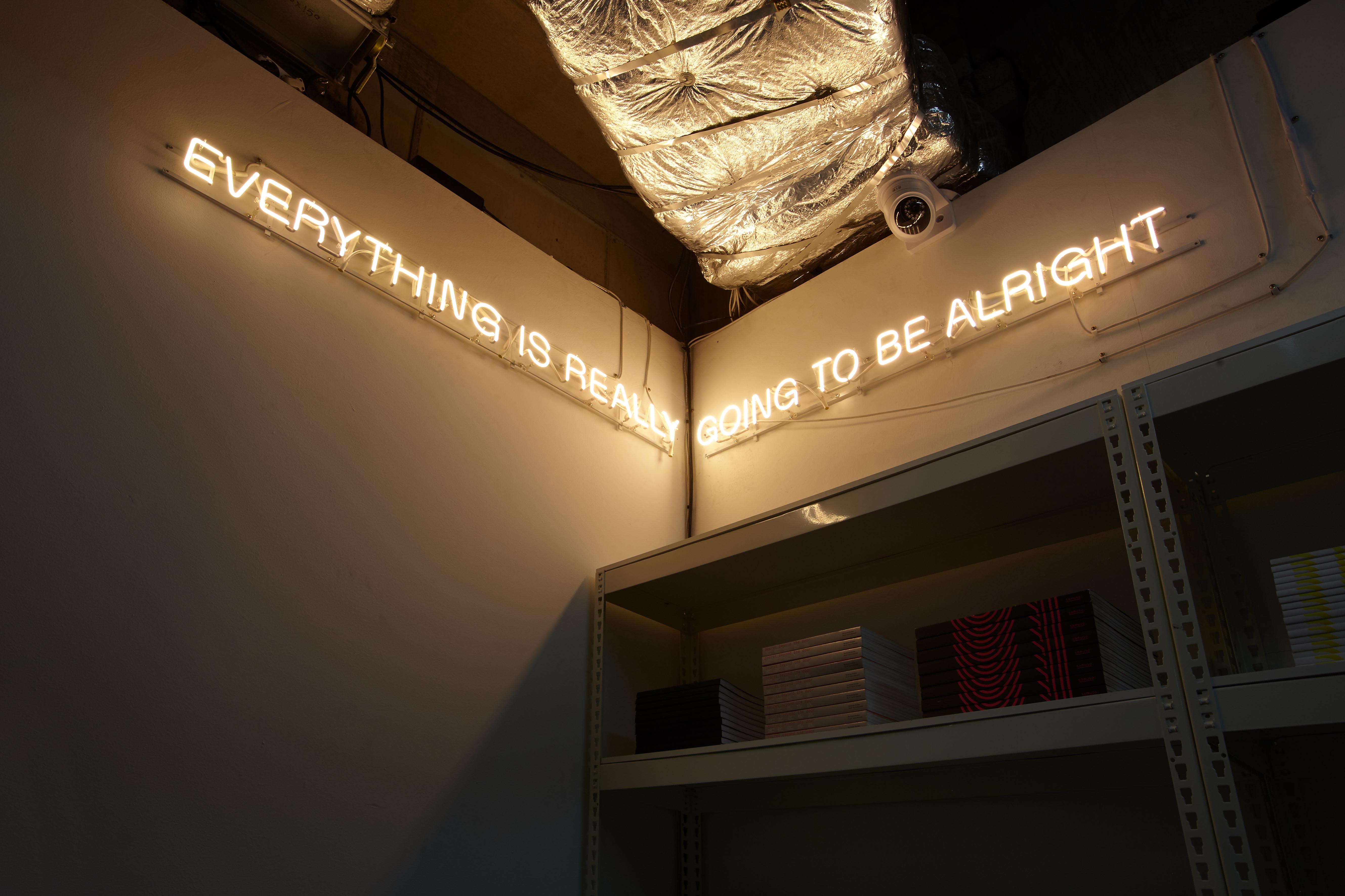 EVERYTHING IS REALLY GOING TO BE ALRIGHT is an homage to a site-specific work by Martin Creed, Work No. 203: EVERYTHING IS GOING TO BE ALRIGHT (1999). ‘EVERYTHING IS REALLY GOING TO BE ALRIGHT’ is meant to be comforting, as it is an optimistic kind of expression. This phrase is the summary of a continuous inner monologue I experience regarding the conscious and unconscious exposure to the tension of confrontation between the North and the South, as well as to the previous history of this specific site. Simultaneously, this phrase, which doesn’t specify its audience, is able to deliver a different meaning or realization to each individual who encounters it.